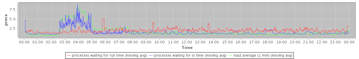 avg(processes waiting for run time) = 1.41 avg(processes waiting for io time) = 0.71 avg(load average (1 min)) = 1.69