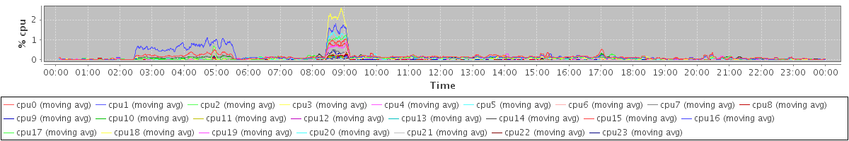 avg(cpu0) = 0.13 avg(cpu1) = 0.19 avg(cpu2) = 0.08 avg(cpu3) = 0.09 avg(cpu4) = 0.05 avg(cpu5) = 0.05 avg(cpu6) = 0.02 avg(cpu7) = 0.05 avg(cpu8) = 0.01 avg(cpu9) = 0.01 avg(cpu10) = 0.04 avg(cpu11) = 0.01 avg(cpu12) = 0.01 avg(cpu13) = 0.01 avg(cpu14) = 0.05 avg(cpu15) = 0.06 avg(cpu16) = 0.04 avg(cpu17) = 0.04 avg(cpu18) = 0.05 avg(cpu19) = 0.04 avg(cpu20) = 0.03 avg(cpu21) = 0.00 avg(cpu22) = 0.01 avg(cpu23) = 0.00