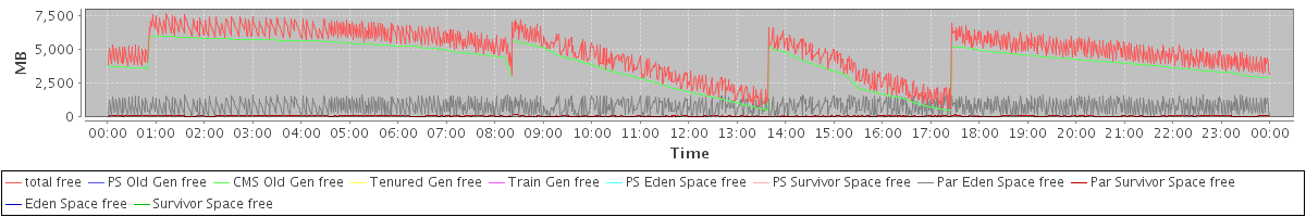avg(total free) = 4854.10 avg(PS Old Gen free) = 0.00 avg(CMS Old Gen free) = 3987.71 avg(Tenured Gen free) = 0.00 avg(Train Gen free) = 0.00 avg(PS Eden Space free) = 0.00 avg(PS Survivor Space free) = 0.00 avg(Par Eden Space free) = 796.59 avg(Par Survivor Space free) = 69.80 avg(Eden Space free) = 0.00 avg(Survivor Space free) = 0.00