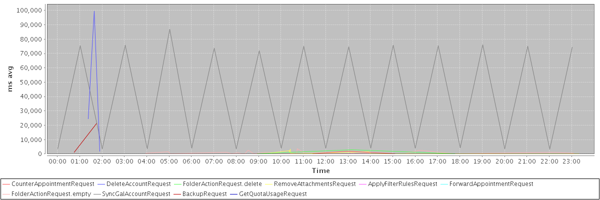 avg(CounterAppointmentRequest) = 747.33 avg(DeleteAccountRequest) = 47261.50 avg(FolderActionRequest.delete) = 1065.00 avg(RemoveAttachmentsRequest) = 1031.92 avg(ApplyFilterRulesRequest) = 7200.00 avg(ForwardAppointmentRequest) = 487.00 avg(FolderActionRequest.empty) = 500.66 avg(SyncGalAccountRequest) = 39823.71 avg(BackupRequest) = 11315.50 avg(GetQuotaUsageRequest) = 1340.00