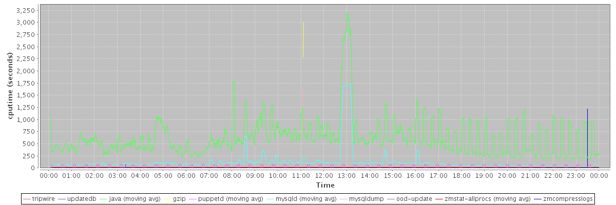 avg(tripwire) = 1955.00 avg(updatedb) = 24.85 avg(java) = 632.25 avg(gzip) = 2648.50 avg(puppetd) = 15.35 avg(mysqld) = 117.88 avg(mysqldump) = 1196.00 avg(ood-update) = 14.00 avg(zmstat-allprocs) = 14.77 avg(zmcompresslogs) = 607.00