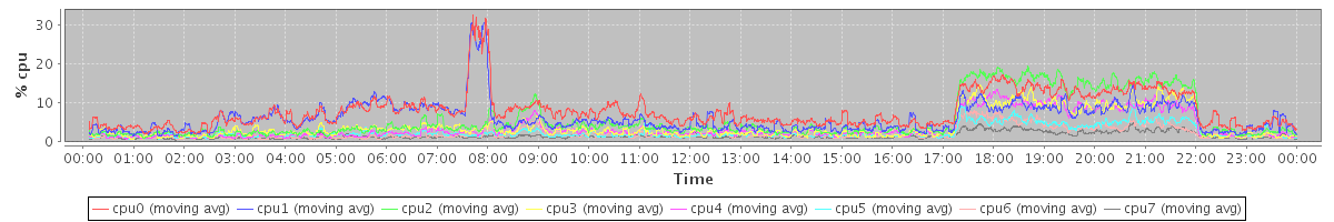 avg(cpu0) = 26.12 avg(cpu1) = 17.34 avg(cpu2) = 0.48 avg(cpu3) = 0.86 avg(cpu4) = 0.14 avg(cpu5) = 0.23 avg(cpu6) = 0.10 avg(cpu7) = 0.08