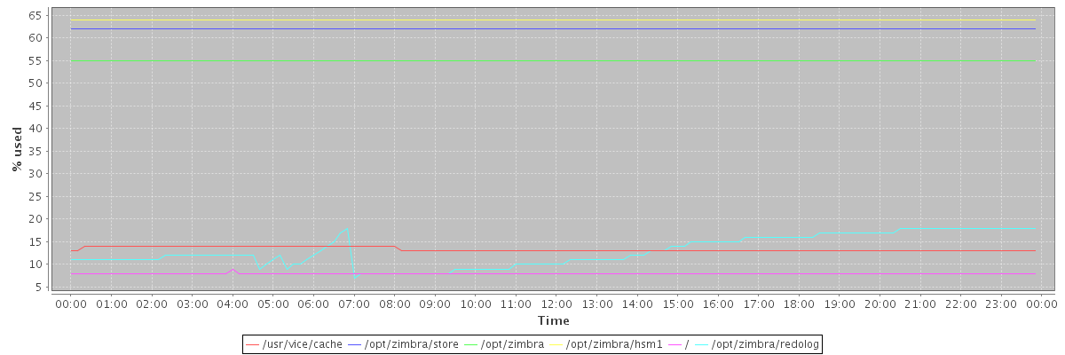 avg(/usr/vice/cache) = 13.33 avg(/opt/zimbra/store) = 62.00 avg(/opt/zimbra) = 55.00 avg(/opt/zimbra/hsm1) = 64.00 avg(/) = 8.01 avg(/opt/zimbra/redolog) = 12.97