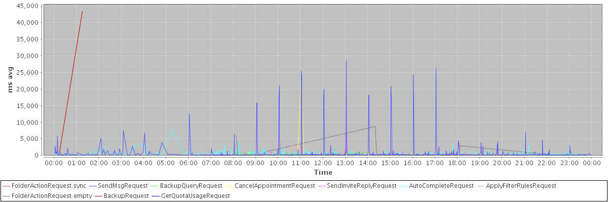 avg(FolderActionRequest.sync) = 2515.00 avg(SendMsgRequest) = 707.50 avg(BackupQueryRequest) = 455.60 avg(CancelAppointmentRequest) = 415.19 avg(SendInviteReplyRequest) = 365.39 avg(AutoCompleteRequest) = 373.51 avg(ApplyFilterRulesRequest) = 2212.00 avg(FolderActionRequest.empty) = 1014.12 avg(BackupRequest) = 22200.00 avg(GetQuotaUsageRequest) = 1177.00