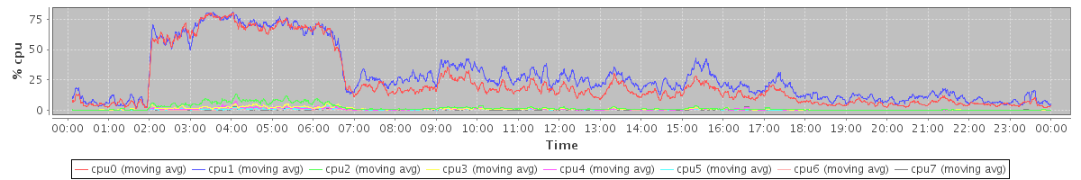avg(cpu0) = 1.23 avg(cpu1) = 1.23 avg(cpu2) = 0.74 avg(cpu3) = 0.74 avg(cpu4) = 0.56 avg(cpu5) = 0.51 avg(cpu6) = 0.40 avg(cpu7) = 0.33