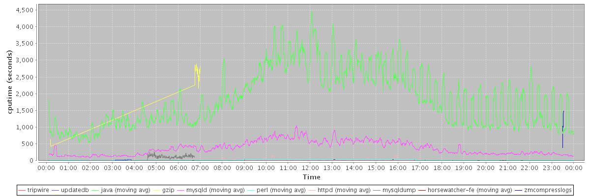 avg(tripwire) = 1868.00 avg(updatedb) = 19.92 avg(java) = 1864.61 avg(gzip) = 2407.91 avg(mysqld) = 370.21 avg(perl) = 20.24 avg(httpd) = 11.77 avg(mysqldump) = 120.20 avg(horsewatcher-fe) = 17.82 avg(zmcompresslogs) = 1057.00