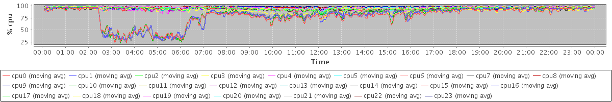 avg(cpu0) = 78.18 avg(cpu1) = 79.48 avg(cpu2) = 95.09 avg(cpu3) = 95.37 avg(cpu4) = 97.00 avg(cpu5) = 97.23 avg(cpu6) = 97.48 avg(cpu7) = 81.03 avg(cpu8) = 97.99 avg(cpu9) = 98.34 avg(cpu10) = 80.70 avg(cpu11) = 98.61 avg(cpu12) = 96.74 avg(cpu13) = 97.04 avg(cpu14) = 94.08 avg(cpu15) = 93.85 avg(cpu16) = 95.46 avg(cpu17) = 95.60 avg(cpu18) = 89.84 avg(cpu19) = 94.19 avg(cpu20) = 95.72 avg(cpu21) = 98.72 avg(cpu22) = 97.68 avg(cpu23) = 99.06