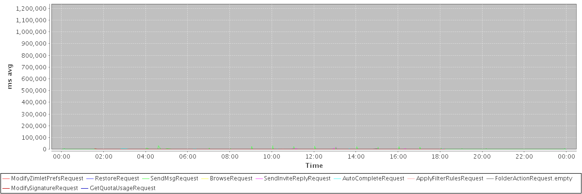 avg(ModifyZimletPrefsRequest) = 1005.00 avg(RestoreRequest) = 1179301.00 avg(SendMsgRequest) = 681.65 avg(BrowseRequest) = 464.00 avg(SendInviteReplyRequest) = 751.70 avg(AutoCompleteRequest) = 441.79 avg(ApplyFilterRulesRequest) = 3048.75 avg(FolderActionRequest.empty) = 649.13 avg(ModifySignatureRequest) = 430.83 avg(GetQuotaUsageRequest) = 1444.00