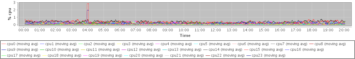 avg(cpu0) = 0.18 avg(cpu1) = 0.12 avg(cpu2) = 0.06 avg(cpu3) = 0.06 avg(cpu4) = 0.03 avg(cpu5) = 0.03 avg(cpu6) = 0.01 avg(cpu7) = 0.04 avg(cpu8) = 0.01 avg(cpu9) = 0.01 avg(cpu10) = 0.04 avg(cpu11) = 0.00 avg(cpu12) = 0.01 avg(cpu13) = 0.01 avg(cpu14) = 0.04 avg(cpu15) = 0.04 avg(cpu16) = 0.04 avg(cpu17) = 0.03 avg(cpu18) = 0.06 avg(cpu19) = 0.05 avg(cpu20) = 0.03 avg(cpu21) = 0.00 avg(cpu22) = 0.00 avg(cpu23) = 0.00