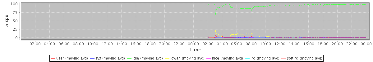 avg(user) = 1.60 avg(sys) = 0.31 avg(idle) = 95.06 avg(iowait) = 2.91 avg(nice) = 0.09 avg(irq) = 0.00 avg(softirq) = 0.02