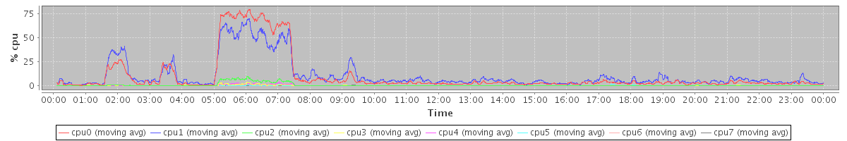 avg(cpu0) = 10.11 avg(cpu1) = 10.87 avg(cpu2) = 0.60 avg(cpu3) = 0.18 avg(cpu4) = 0.18 avg(cpu5) = 0.06 avg(cpu6) = 0.12 avg(cpu7) = 0.02