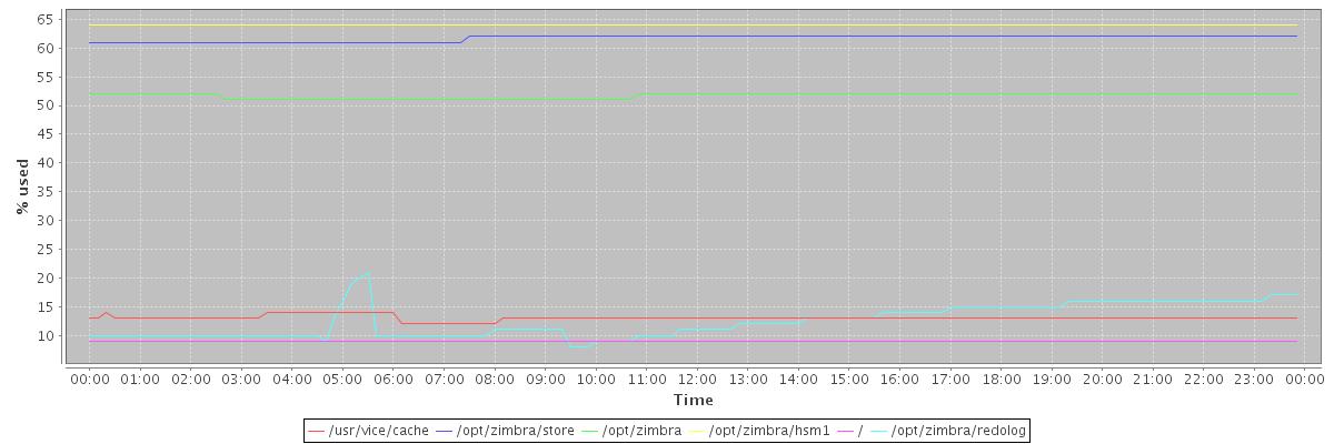 avg(/usr/vice/cache) = 13.03 avg(/opt/zimbra/store) = 61.69 avg(/opt/zimbra) = 51.66 avg(/opt/zimbra/hsm1) = 64.00 avg(/) = 9.00 avg(/opt/zimbra/redolog) = 12.50
