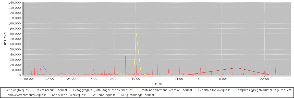 avg(SendMsgRequest) = 1043.45 avg(DeleteAccountRequest) = 11901.00 avg(GetAggregateQuotaUsageOnServerRequest) = 1155.00 avg(CreateAppointmentExceptionRequest) = 4055.88 avg(ExportMailboxRequest) = 134462.00 avg(ComputeAggregateQuotaUsageRequest) = 3587.00 avg(RemoveAttachmentsRequest) = 9199.17 avg(ApplyFilterRulesRequest) = 11468.50 avg(GetConvRequest) = 3035.20 avg(GetQuotaUsageRequest) = 1336.00