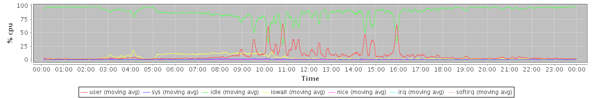 avg(user) = 7.10 avg(sys) = 0.48 avg(idle) = 88.50 avg(iowait) = 3.76 avg(nice) = 0.10 avg(irq) = 0.00 avg(softirq) = 0.05