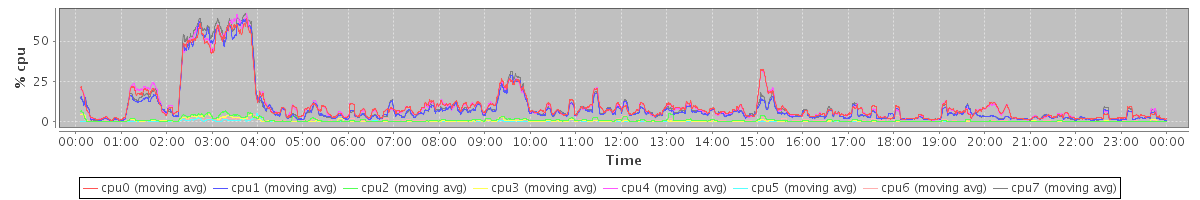 avg(cpu0) = 10.46 avg(cpu1) = 8.94 avg(cpu2) = 0.85 avg(cpu3) = 0.49 avg(cpu4) = 10.46 avg(cpu5) = 0.17 avg(cpu6) = 0.75 avg(cpu7) = 9.53