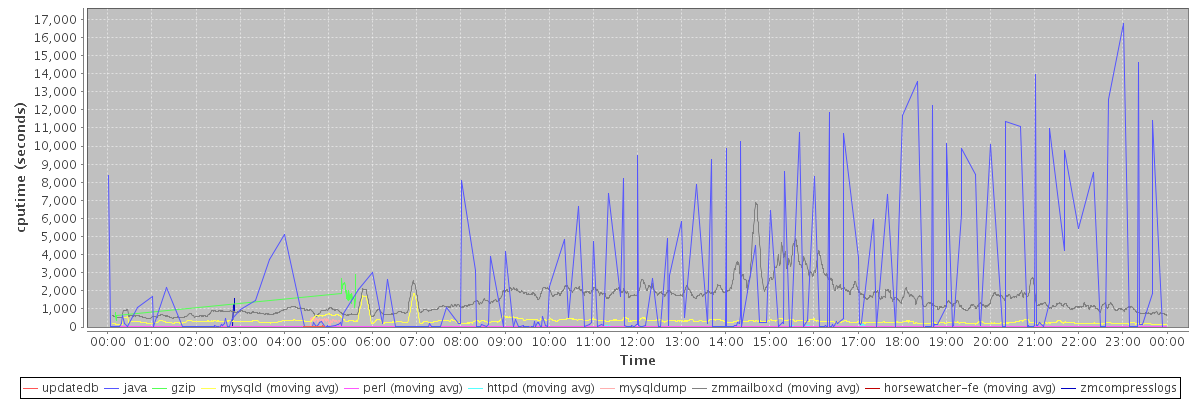avg(updatedb) = 27.84 avg(java) = 1655.20 avg(gzip) = 1775.62 avg(mysqld) = 330.43 avg(perl) = 17.38 avg(httpd) = 12.22 avg(mysqldump) = 345.20 avg(zmmailboxd) = 1528.95 avg(horsewatcher-fe) = 14.35 avg(zmcompresslogs) = 1054.33
