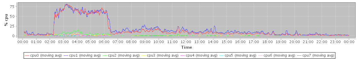 avg(cpu0) = 0.14 avg(cpu1) = 0.24 avg(cpu2) = 0.09 avg(cpu3) = 0.09 avg(cpu4) = 0.05 avg(cpu5) = 0.05 avg(cpu6) = 0.03 avg(cpu7) = 0.02