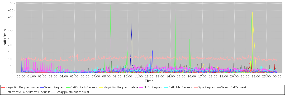 max(MsgActionRequest.move) = 78.00 max(SearchRequest) = 161.00 max(GetContactsRequest) = 486.00 max(MsgActionRequest.delete) = 436.00 max(NoOpRequest) = 135.00 max(GetFolderRequest) = 66.00 max(SyncRequest) = 143.00 max(SearchGalRequest) = 82.00 max(GetEffectiveFolderPermsRequest) = 100.00 max(GetAppointmentRequest) = 366.00
