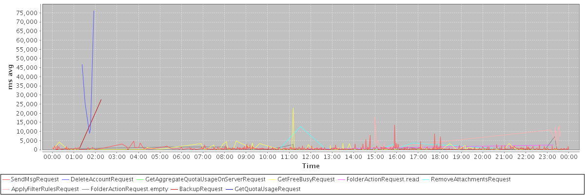 avg(SendMsgRequest) = 573.02 avg(DeleteAccountRequest) = 33632.20 avg(GetAggregateQuotaUsageOnServerRequest) = 2715.00 avg(GetFreeBusyRequest) = 850.65 avg(FolderActionRequest.read) = 1241.00 avg(RemoveAttachmentsRequest) = 2500.33 avg(ApplyFilterRulesRequest) = 6906.00 avg(FolderActionRequest.empty) = 602.38 avg(BackupRequest) = 14189.00 avg(GetQuotaUsageRequest) = 2998.00