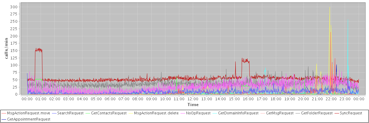 max(MsgActionRequest.move) = 213.00 max(SearchRequest) = 72.00 max(GetContactsRequest) = 62.00 max(MsgActionRequest.delete) = 300.00 max(NoOpRequest) = 84.00 max(GetDomainInfoRequest) = 257.00 max(GetMsgRequest) = 47.00 max(GetFolderRequest) = 95.00 max(SyncRequest) = 159.00 max(GetAppointmentRequest) = 102.00