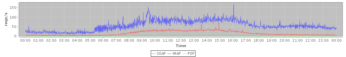 Host zm03.stanford.edu: Mailboxd: Request Rate by Client Protocol