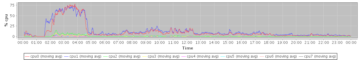avg(cpu0) = 11.37 avg(cpu1) = 13.68 avg(cpu2) = 0.91 avg(cpu3) = 0.58 avg(cpu4) = 0.30 avg(cpu5) = 0.28 avg(cpu6) = 0.10 avg(cpu7) = 0.11
