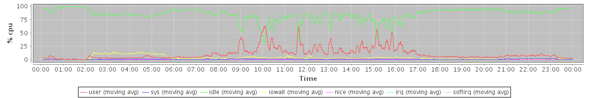 avg(user) = 10.87 avg(sys) = 0.68 avg(idle) = 84.85 avg(iowait) = 3.39 avg(nice) = 0.10 avg(irq) = 0.00 avg(softirq) = 0.11