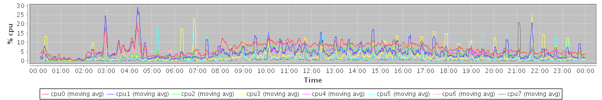 avg(cpu0) = 6.36 avg(cpu1) = 4.69 avg(cpu2) = 3.83 avg(cpu3) = 2.88 avg(cpu4) = 3.61 avg(cpu5) = 1.72 avg(cpu6) = 4.24 avg(cpu7) = 0.82