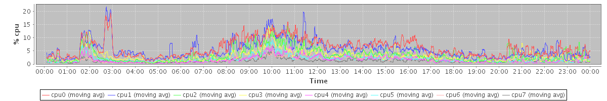 avg(cpu0) = 0.16 avg(cpu1) = 0.17 avg(cpu2) = 0.06 avg(cpu3) = 0.04 avg(cpu4) = 0.04 avg(cpu5) = 0.03 avg(cpu6) = 0.01 avg(cpu7) = 0.02
