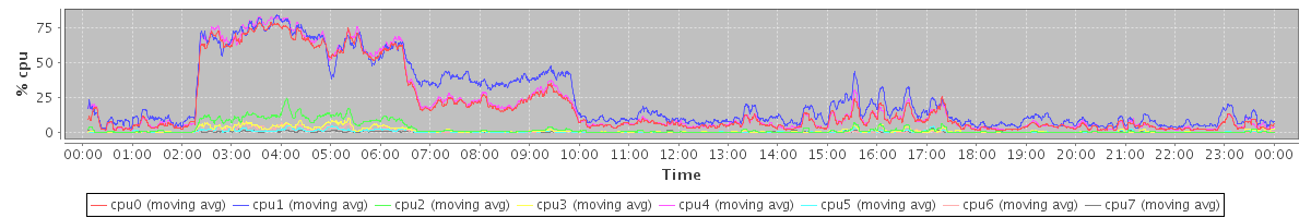 avg(cpu0) = 18.92 avg(cpu1) = 24.45 avg(cpu2) = 2.53 avg(cpu3) = 1.38 avg(cpu4) = 19.99 avg(cpu5) = 0.64 avg(cpu6) = 0.74 avg(cpu7) = 0.35