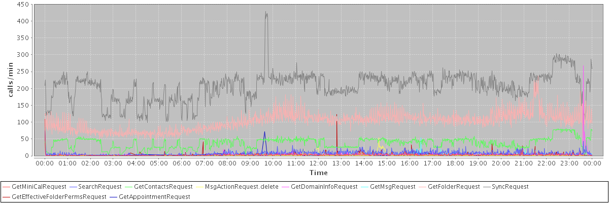 max(GetMiniCalRequest) = 109.00 max(SearchRequest) = 74.00 max(GetContactsRequest) = 81.00 max(MsgActionRequest.delete) = 53.00 max(GetDomainInfoRequest) = 268.00 max(GetMsgRequest) = 54.00 max(GetFolderRequest) = 237.00 max(SyncRequest) = 429.00 max(GetEffectiveFolderPermsRequest) = 123.00 max(GetAppointmentRequest) = 71.00