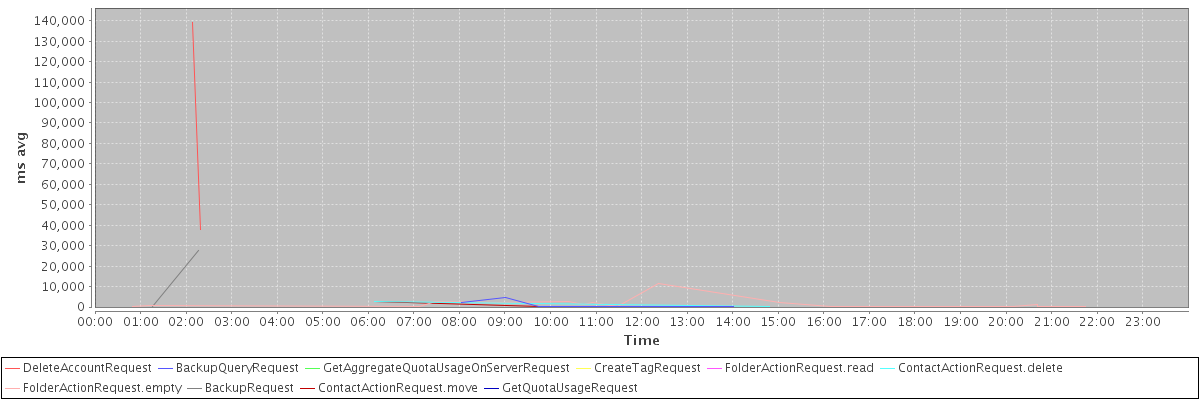 avg(DeleteAccountRequest) = 88605.00 avg(BackupQueryRequest) = 1418.00 avg(GetAggregateQuotaUsageOnServerRequest) = 1761.00 avg(CreateTagRequest) = 1439.00 avg(FolderActionRequest.read) = 2127.00 avg(ContactActionRequest.delete) = 1282.50 avg(FolderActionRequest.empty) = 1297.09 avg(BackupRequest) = 13966.50 avg(ContactActionRequest.move) = 1454.00 avg(GetQuotaUsageRequest) = 1920.00