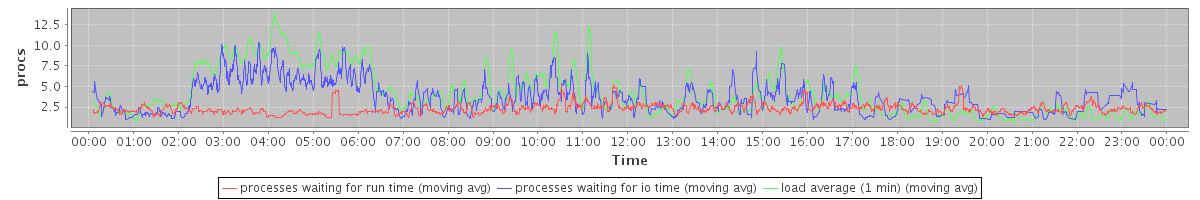 avg(processes waiting for run time) = 1.82 avg(processes waiting for io time) = 2.48 avg(load average (1 min)) = 4.10
