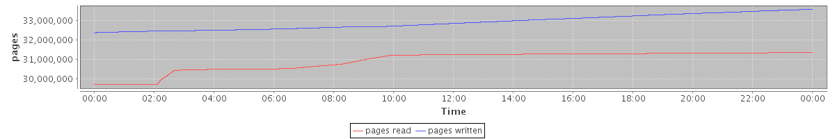 avg(pages read) = 30935910.43 avg(pages written) = 32898370.67