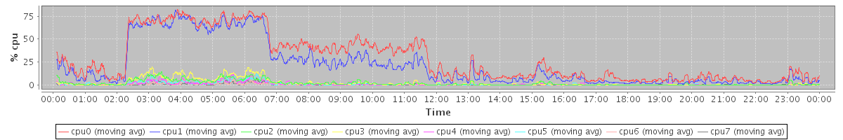 avg(cpu0) = 0.25 avg(cpu1) = 0.28 avg(cpu2) = 0.10 avg(cpu3) = 0.11 avg(cpu4) = 0.07 avg(cpu5) = 0.07 avg(cpu6) = 0.04 avg(cpu7) = 0.06