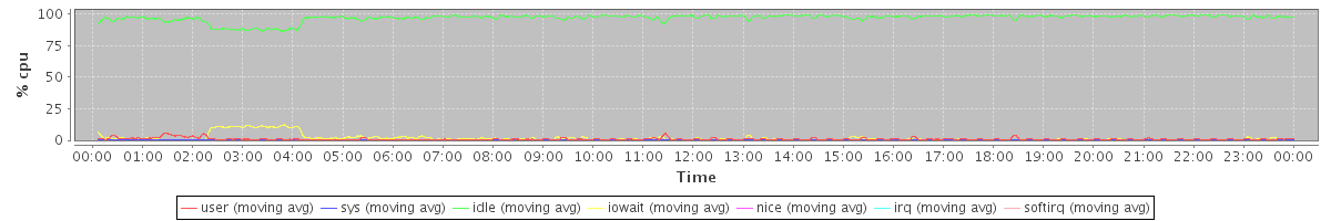 avg(user) = 1.00 avg(sys) = 0.18 avg(idle) = 97.08 avg(iowait) = 1.66 avg(nice) = 0.09 avg(irq) = 0.00 avg(softirq) = 0.00