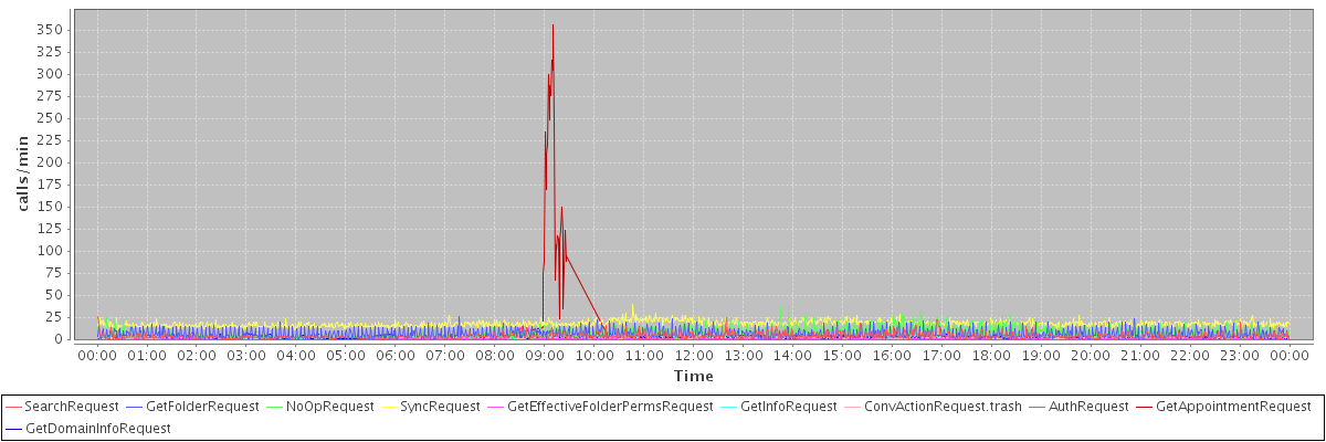 max(SearchRequest) = 26.00 max(GetFolderRequest) = 26.00 max(NoOpRequest) = 37.00 max(SyncRequest) = 40.00 max(GetEffectiveFolderPermsRequest) = 19.00 max(GetInfoRequest) = 21.00 max(ConvActionRequest.trash) = 17.00 max(AuthRequest) = 20.00 max(GetAppointmentRequest) = 356.00 max(GetDomainInfoRequest) = 19.00