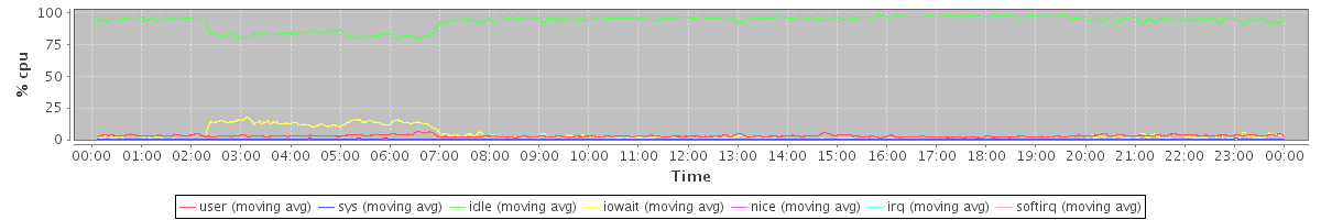 avg(user) = 2.96 avg(sys) = 0.48 avg(idle) = 92.69 avg(iowait) = 3.69 avg(nice) = 0.10 avg(irq) = 0.00 avg(softirq) = 0.08