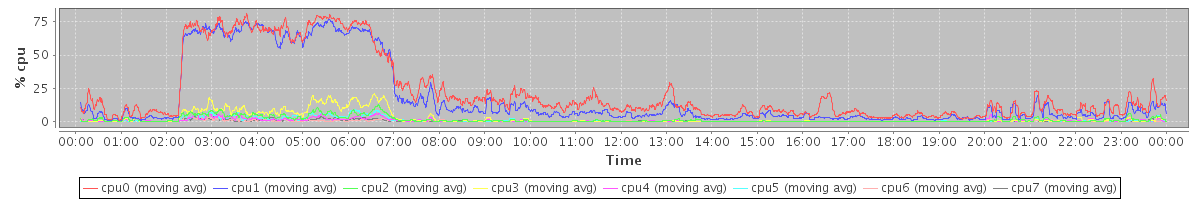 avg(cpu0) = 1.23 avg(cpu1) = 1.22 avg(cpu2) = 0.79 avg(cpu3) = 0.70 avg(cpu4) = 0.45 avg(cpu5) = 0.42 avg(cpu6) = 0.33 avg(cpu7) = 0.29