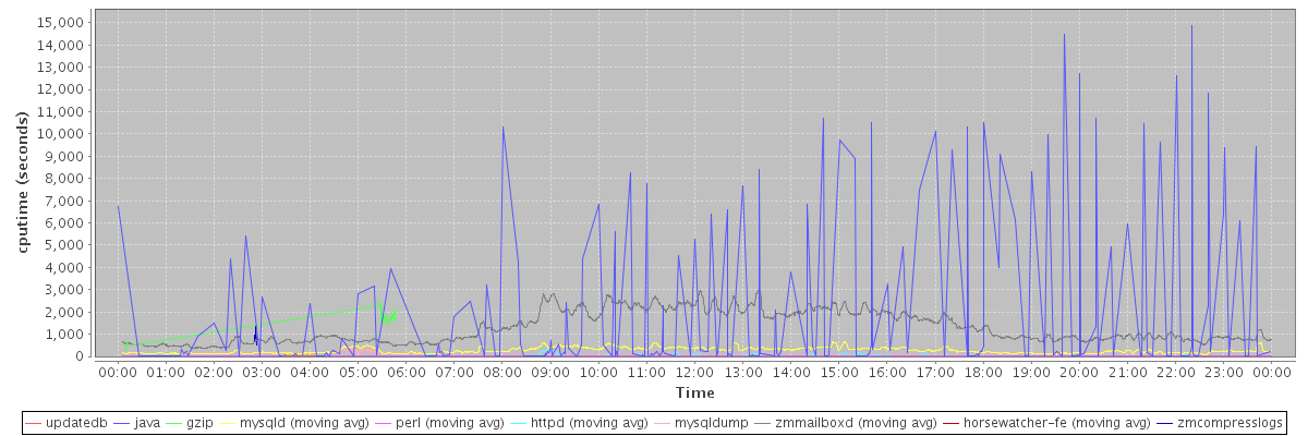 avg(updatedb) = 20.35 avg(java) = 1632.94 avg(gzip) = 1720.24 avg(mysqld) = 262.49 avg(perl) = 16.23 avg(httpd) = 23.96 avg(mysqldump) = 289.02 avg(zmmailboxd) = 1275.88 avg(horsewatcher-fe) = 16.84 avg(zmcompresslogs) = 887.86