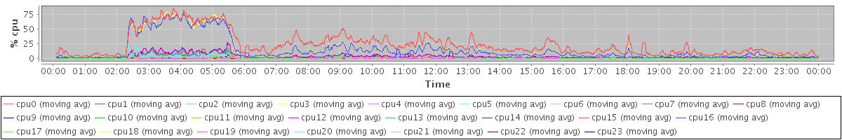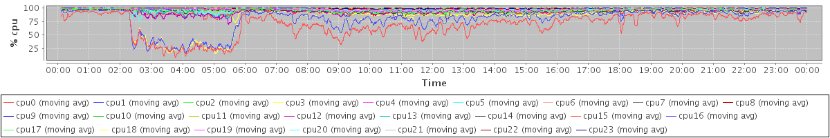 avg(cpu0) = 23.86 avg(cpu1) = 14.78 avg(cpu2) = 0.72 avg(cpu3) = 15.41 avg(cpu4) = 0.28 avg(cpu5) = 1.03 avg(cpu6) = 0.15 avg(cpu7) = 0.21 avg(cpu8) = 0.09 avg(cpu9) = 0.08 avg(cpu10) = 0.06 avg(cpu11) = 0.04 avg(cpu12) = 3.40 avg(cpu13) = 1.70 avg(cpu14) = 0.58 avg(cpu15) = 1.96 avg(cpu16) = 0.57 avg(cpu17) = 0.51 avg(cpu18) = 0.60 avg(cpu19) = 0.46 avg(cpu20) = 0.40 avg(cpu21) = 0.01 avg(cpu22) = 0.02 avg(cpu23) = 0.02