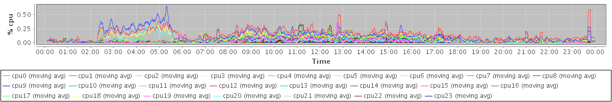 avg(cpu0) = 0.14 avg(cpu1) = 0.12 avg(cpu2) = 0.06 avg(cpu3) = 0.08 avg(cpu4) = 0.04 avg(cpu5) = 0.05 avg(cpu6) = 0.02 avg(cpu7) = 0.01 avg(cpu8) = 0.01 avg(cpu9) = 0.00 avg(cpu10) = 0.00 avg(cpu11) = 0.00 avg(cpu12) = 0.02 avg(cpu13) = 0.01 avg(cpu14) = 0.05 avg(cpu15) = 0.05 avg(cpu16) = 0.04 avg(cpu17) = 0.04 avg(cpu18) = 0.05 avg(cpu19) = 0.03 avg(cpu20) = 0.04 avg(cpu21) = 0.00 avg(cpu22) = 0.00 avg(cpu23) = 0.00