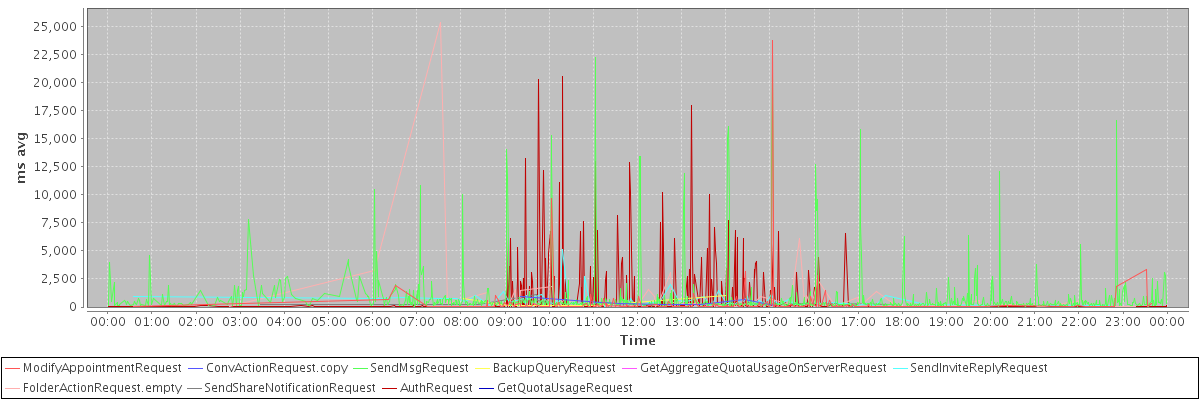 avg(ModifyAppointmentRequest) = 351.81 avg(ConvActionRequest.copy) = 392.38 avg(SendMsgRequest) = 819.80 avg(BackupQueryRequest) = 429.80 avg(GetAggregateQuotaUsageOnServerRequest) = 1249.00 avg(SendInviteReplyRequest) = 554.02 avg(FolderActionRequest.empty) = 975.81 avg(SendShareNotificationRequest) = 363.56 avg(AuthRequest) = 422.46 avg(GetQuotaUsageRequest) = 1573.00