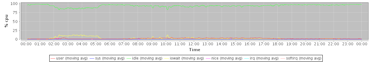 avg(user) = 2.34 avg(sys) = 0.44 avg(idle) = 94.26 avg(iowait) = 2.79 avg(nice) = 0.13 avg(irq) = 0.00 avg(softirq) = 0.04