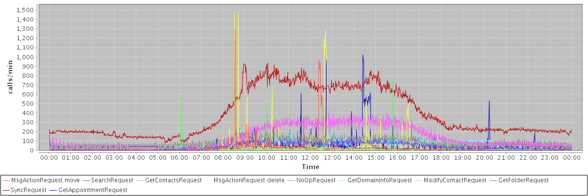 max(MsgActionRequest.move) = 1297.00 max(SearchRequest) = 178.00 max(GetContactsRequest) = 752.00 max(MsgActionRequest.delete) = 1492.00 max(NoOpRequest) = 419.00 max(GetDomainInfoRequest) = 217.00 max(ModifyContactRequest) = 169.00 max(GetFolderRequest) = 268.00 max(SyncRequest) = 935.00 max(GetAppointmentRequest) = 1022.00