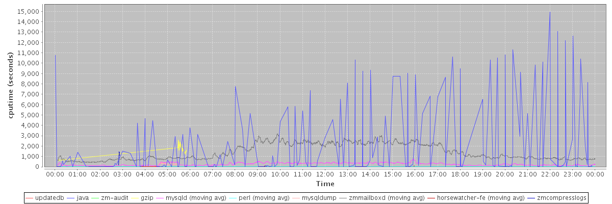 avg(updatedb) = 21.78 avg(java) = 1656.54 avg(zm-audit) = 18.00 avg(gzip) = 1716.72 avg(mysqld) = 251.63 avg(perl) = 15.64 avg(mysqldump) = 276.33 avg(zmmailboxd) = 1409.77 avg(horsewatcher-fe) = 18.17 avg(zmcompresslogs) = 1071.80