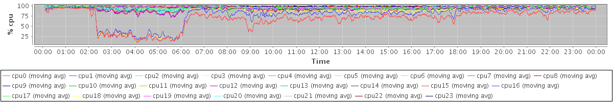 avg(cpu0) = 23.58 avg(cpu1) = 15.21 avg(cpu2) = 0.72 avg(cpu3) = 15.94 avg(cpu4) = 0.26 avg(cpu5) = 1.07 avg(cpu6) = 0.14 avg(cpu7) = 0.22 avg(cpu8) = 0.07 avg(cpu9) = 0.10 avg(cpu10) = 0.07 avg(cpu11) = 0.04 avg(cpu12) = 3.57 avg(cpu13) = 1.78 avg(cpu14) = 0.47 avg(cpu15) = 2.19 avg(cpu16) = 0.56 avg(cpu17) = 0.56 avg(cpu18) = 0.43 avg(cpu19) = 0.49 avg(cpu20) = 0.40 avg(cpu21) = 0.03 avg(cpu22) = 0.01 avg(cpu23) = 0.02