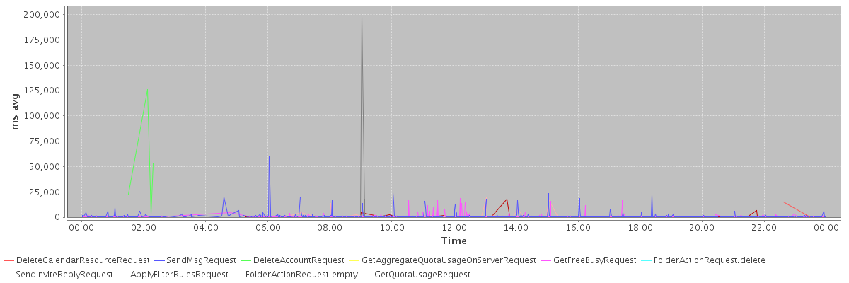 avg(DeleteCalendarResourceRequest) = 7729.50 avg(SendMsgRequest) = 918.01 avg(DeleteAccountRequest) = 50964.00 avg(GetAggregateQuotaUsageOnServerRequest) = 1176.00 avg(GetFreeBusyRequest) = 447.53 avg(FolderActionRequest.delete) = 444.67 avg(SendInviteReplyRequest) = 1468.52 avg(ApplyFilterRulesRequest) = 54620.25 avg(FolderActionRequest.empty) = 672.82 avg(GetQuotaUsageRequest) = 1560.00