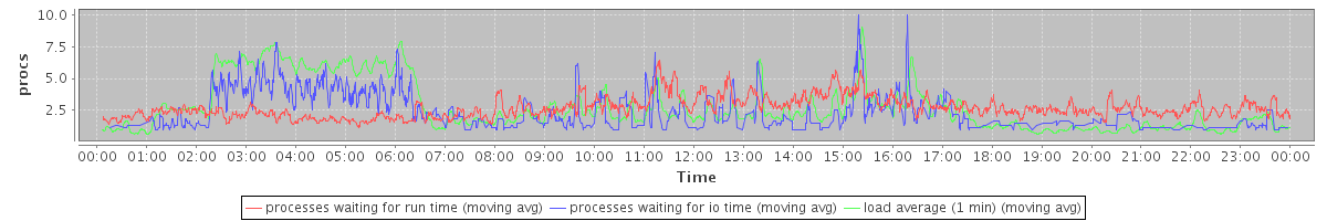 avg(processes waiting for run time) = 2.33 avg(processes waiting for io time) = 1.40 avg(load average (1 min)) = 2.75