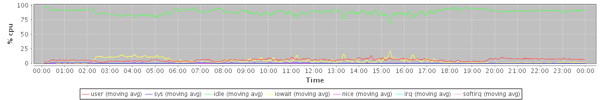 avg(user) = 6.03 avg(sys) = 0.68 avg(idle) = 88.55 avg(iowait) = 4.54 avg(nice) = 0.10 avg(irq) = 0.00 avg(softirq) = 0.11